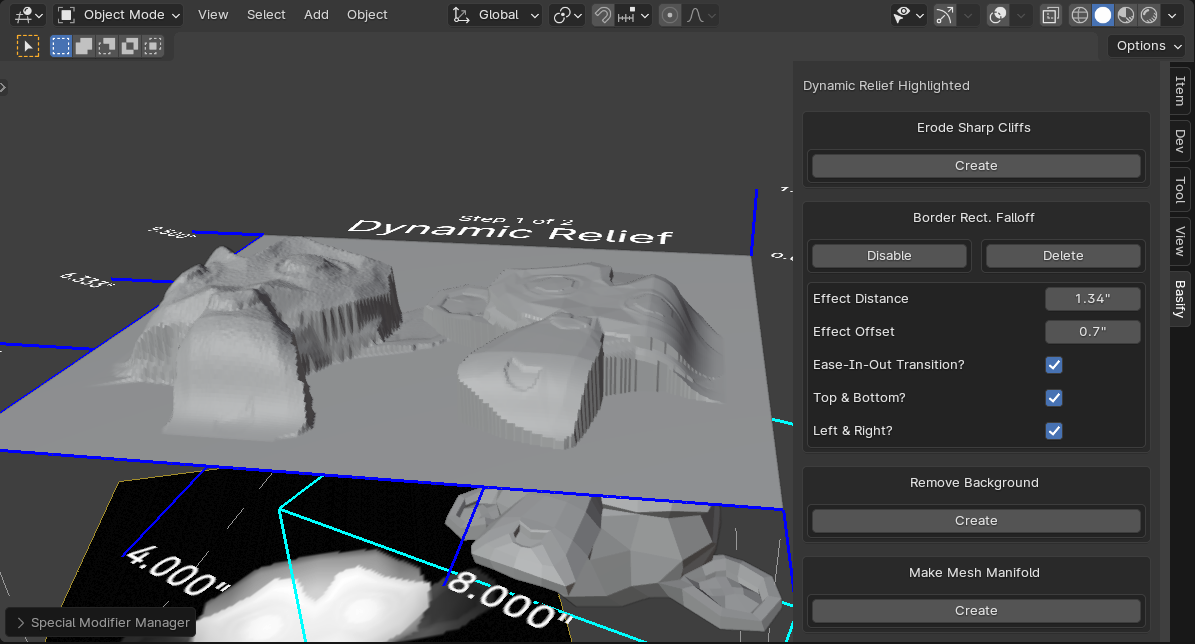 Basify Modifiers can be applied to both Dynamic and Sculptable Reliefs. They are accessed from the Modifiers and Effects Panel.